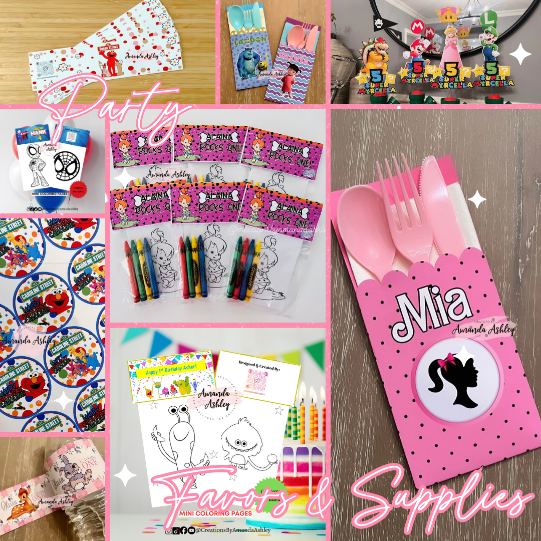Additional party items including favor stickers, coloring favors, dinnerware items and more!