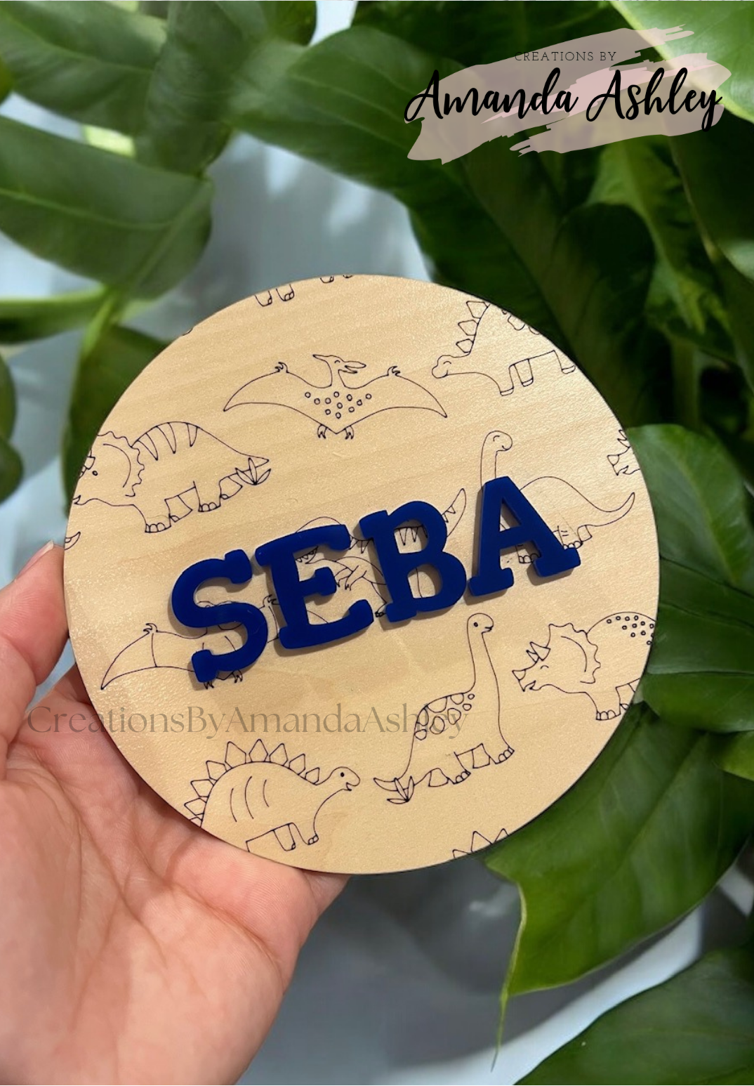 Wood dinosaur themed name round. Perfect to use as a name reveal/announcement, or as room decor!